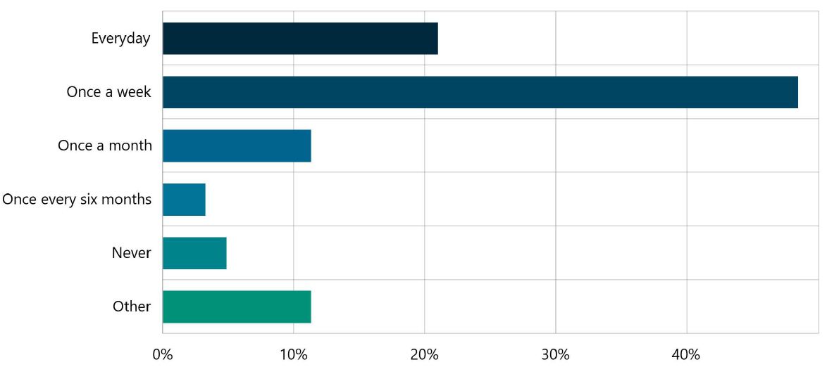 A total of 62 responses were provided. Of these, 80% visited Burgess Reserve regularly, with 20% visiting Burges Reserve everyday, and just under 50% once a weekHow often do you visit the Burgess Reserve?