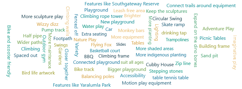 This question prompted many ideas from the community. Of the 62 respondents that answered this question, 16 (26%) said they value or would like more slides, 8 (13%) mentioned a basketball court, and another 8 (13%) suggested trampolines. 6 respondents (10%) would like to see nature play, 6 (10%) value Indigenous planting, and another 6 (10%) want the reserve to be more suitable for all ages.