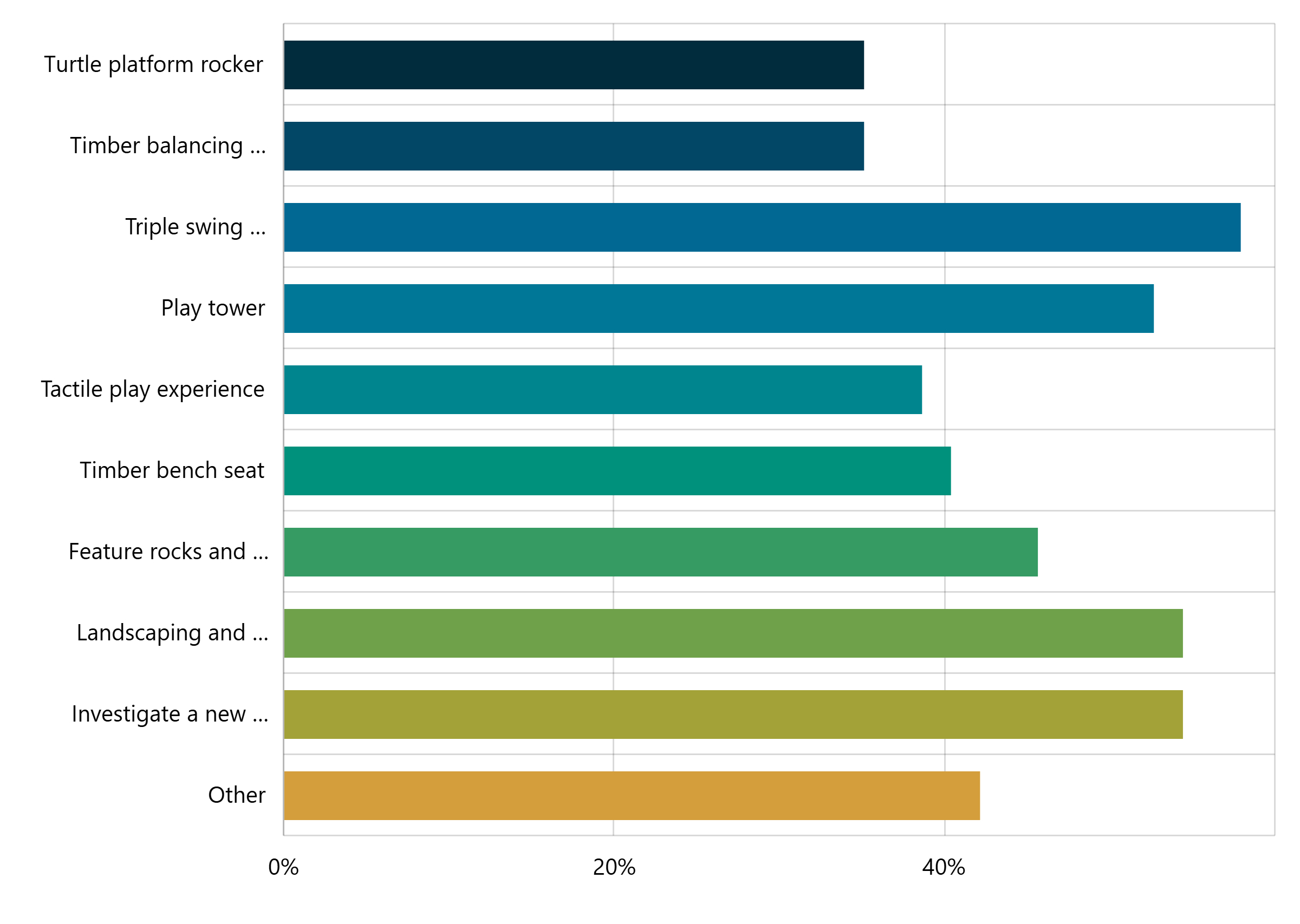We will report back on which play features were included, with the most supported being a triple swing, play tower and a tactile play experience.