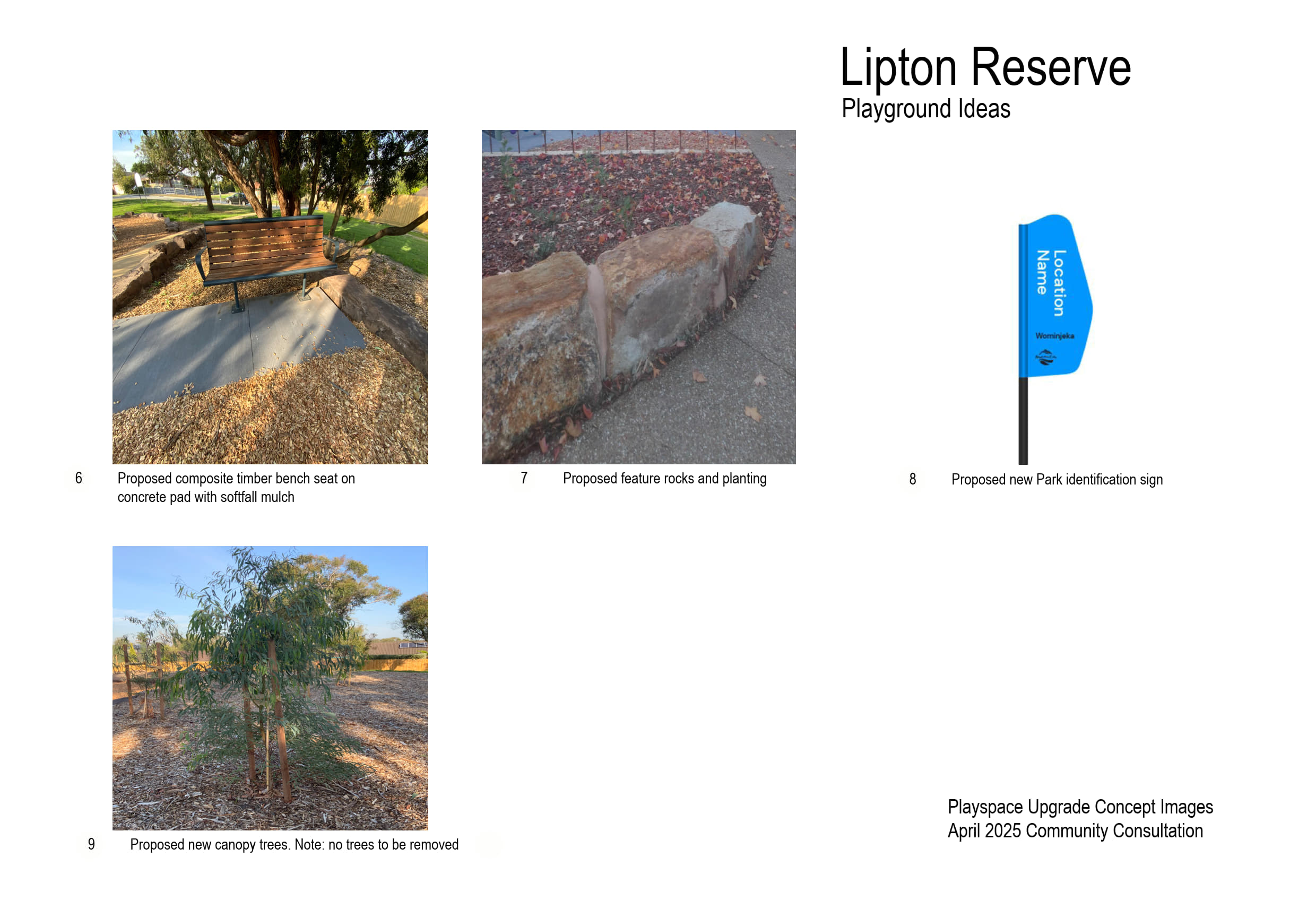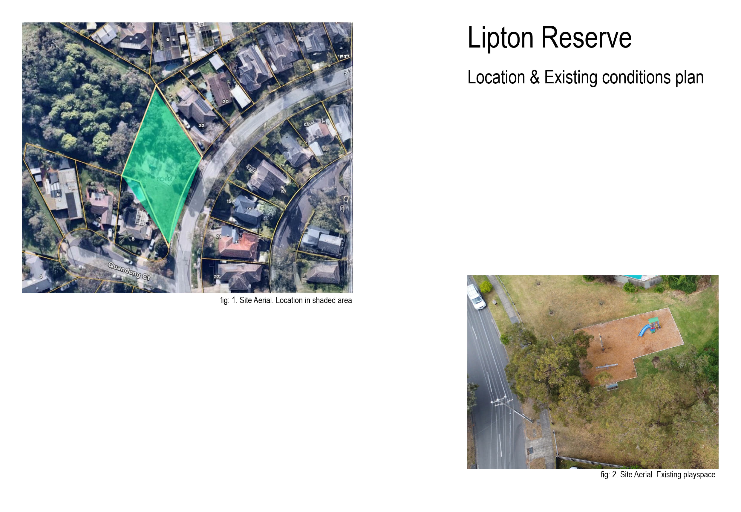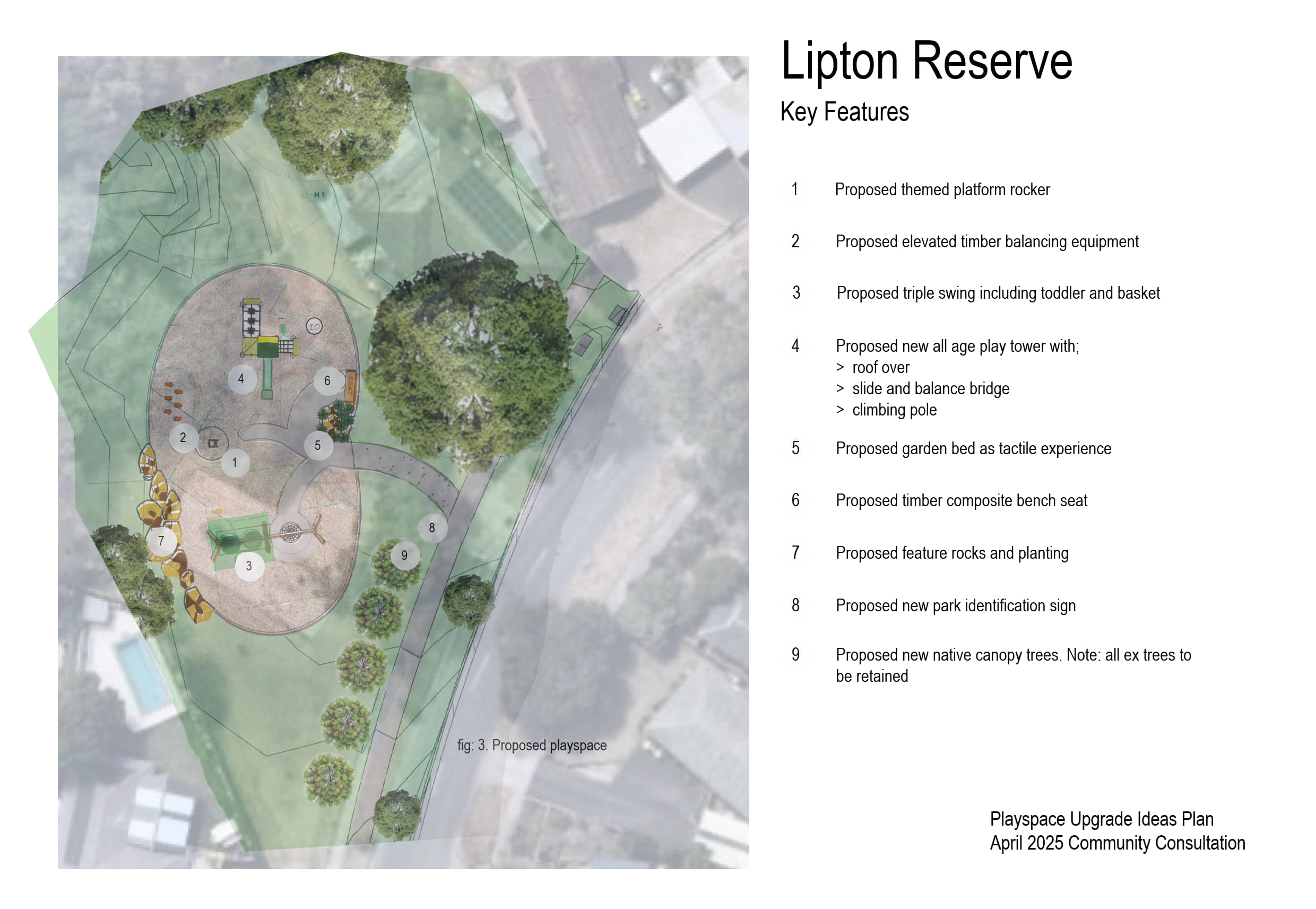 Lipton Reserve is identified as a local minor level play space which is intended to service the immediate local area (400m walking catchment) for regular short-term stays (up to an hour).