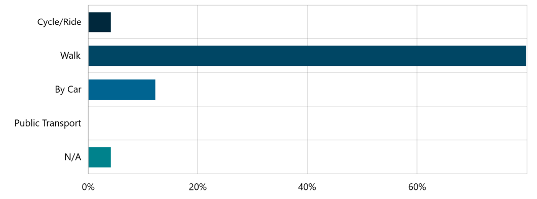 Of the 74 respondents, 59 (80%) walk to Rotary Park. 12% travel there by car, and 4% cycle/ride.