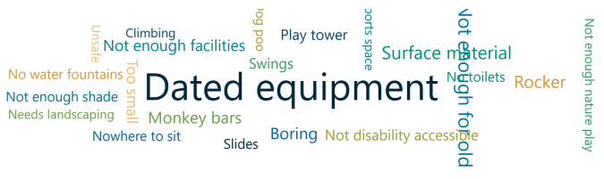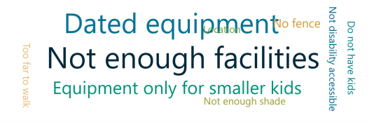 What do you and/or your children DISLIKE about the current features such as, the swings, slide, play towers, monkey bars, climbing net, surface materials?