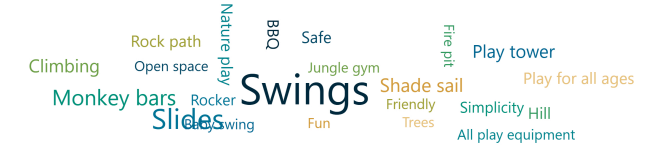 What do you and/or your children LIKE about the current features such as, the swings, slide, play towers, monkey bars, climbing net, surface materials?